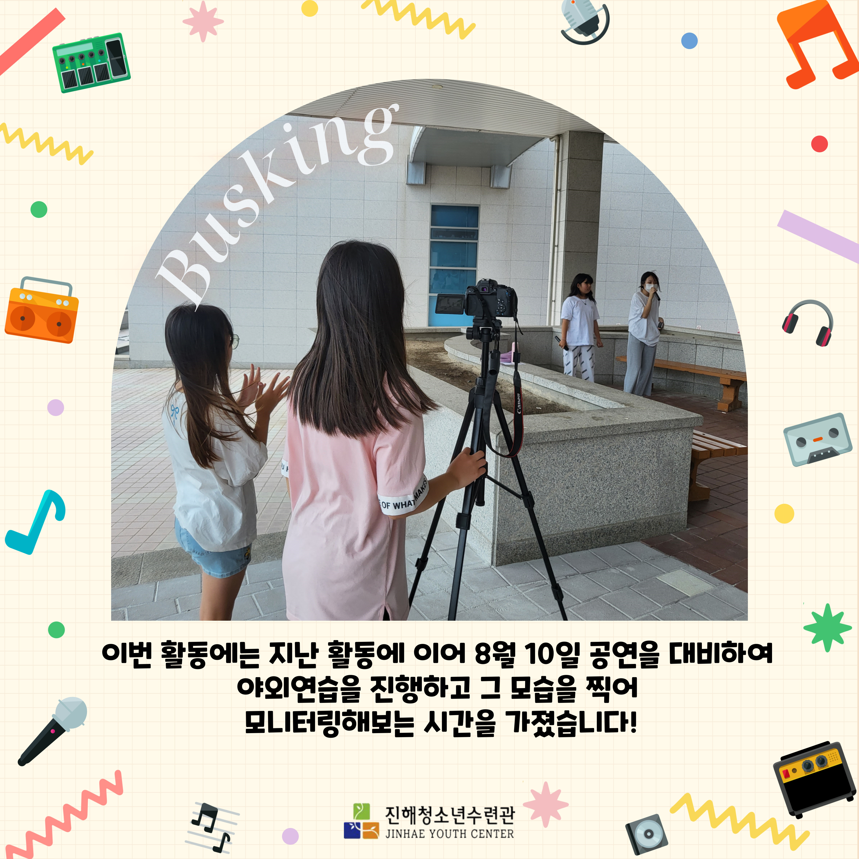 이번 활동에는 지난 활동에 이어 8월 10일 공연을 대비하여 야외연습을 진행하고 그 모습을 찍어 모니터링해보는 시간을 가졌습니다!