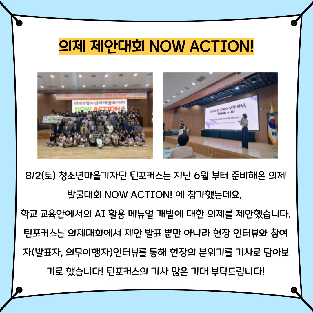의제 제안 대회 현장 취재와 참여자 인터뷰를 통해 현장의 분위기를 기사로 담아보고자합니다. 이후 작성될 틴포커스의 기사에도 많은 관심 부탁드립니다!