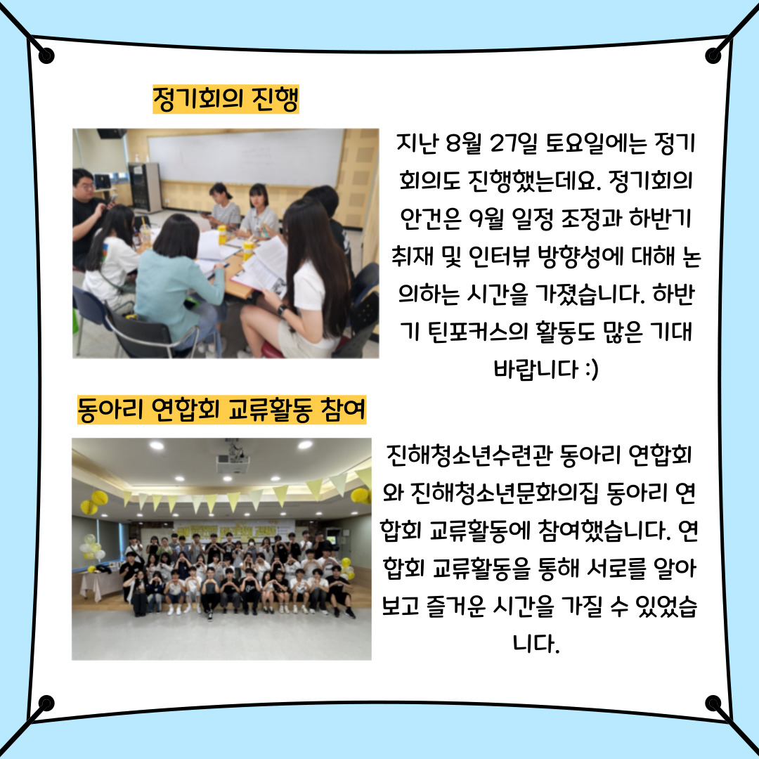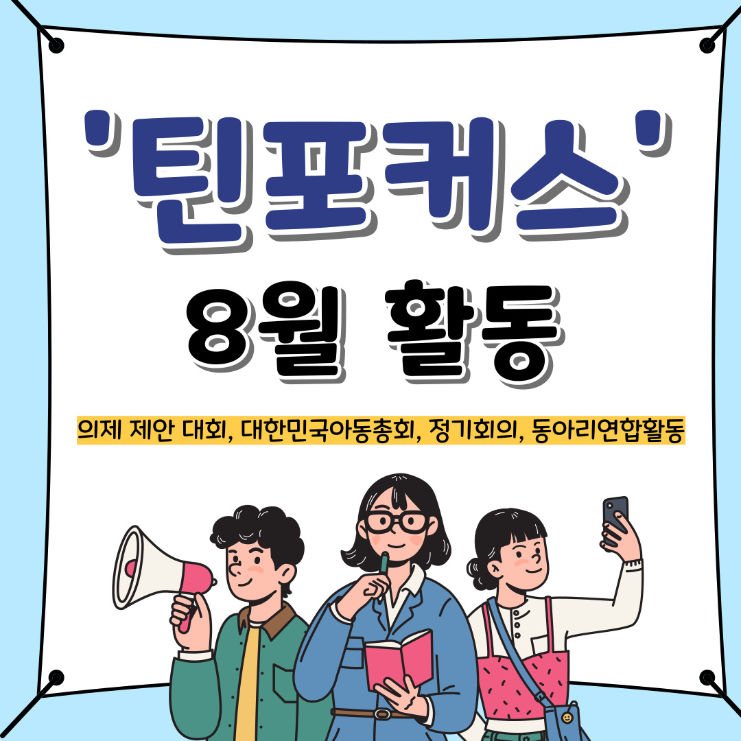 지난 8월 <틴포커스>는 지역의 문제와 소식에 관심을 가지는 의제 제안 활동, 정기 회의, 동아리 연합 활동 참여 등의 활동에 참여했는데요.