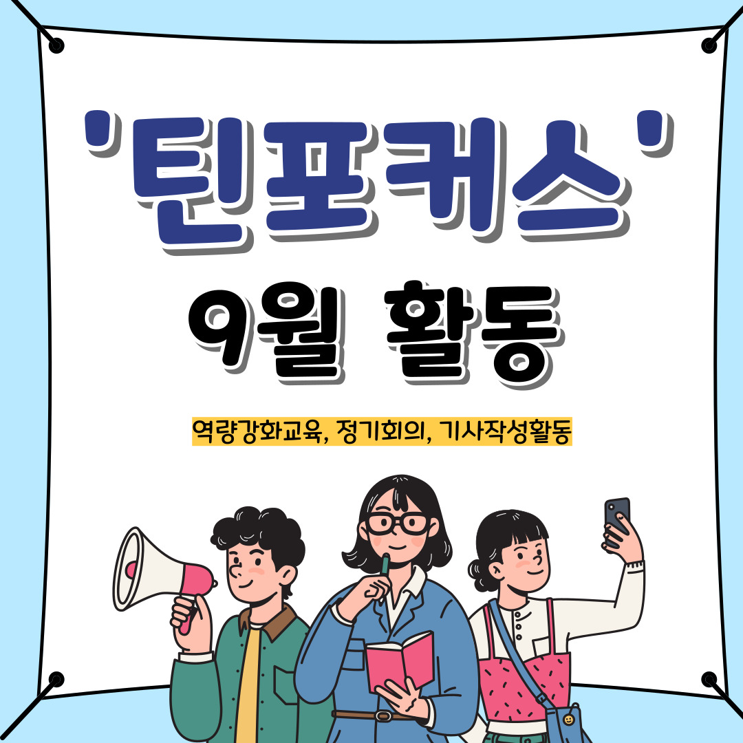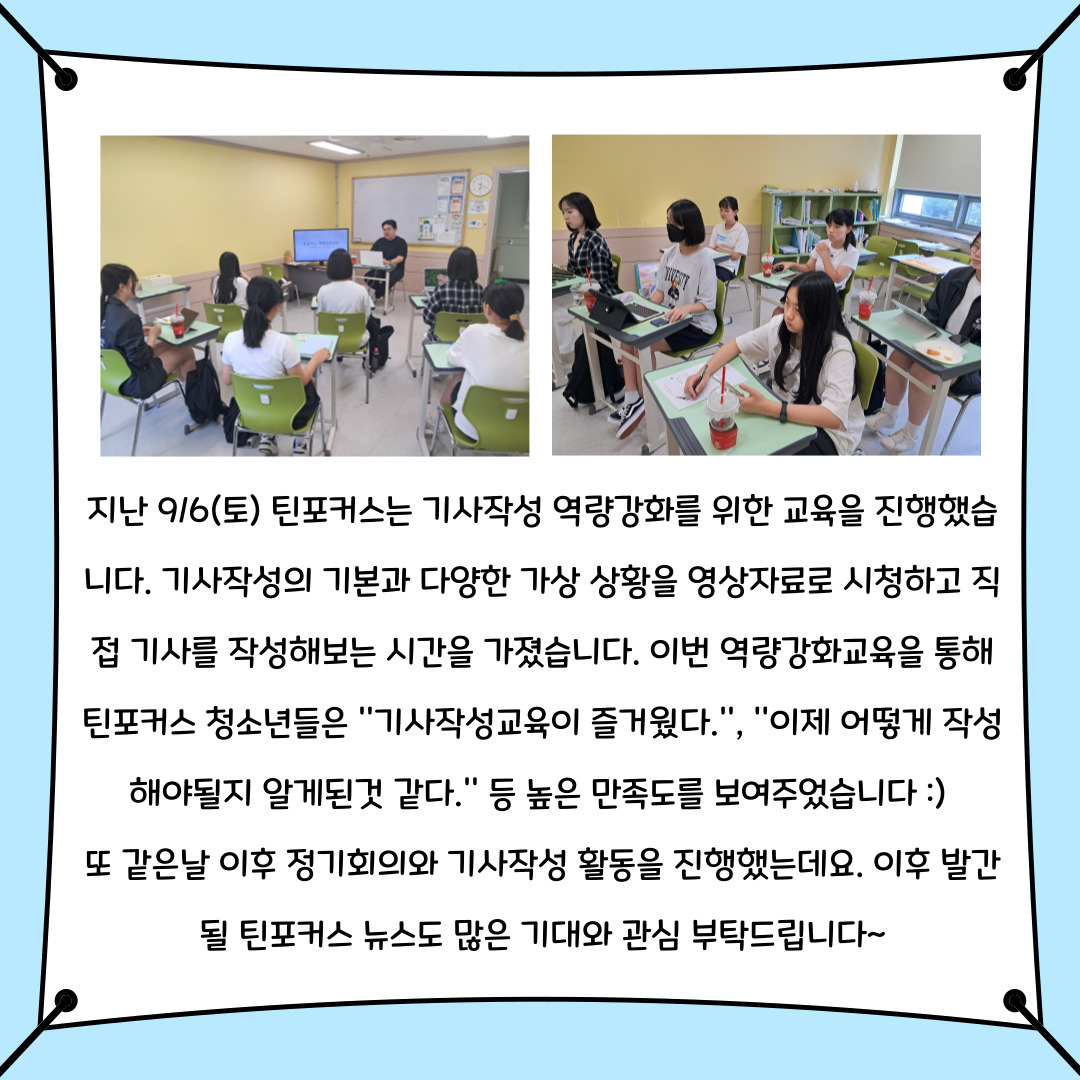 지난 9/2(토) 틴포커스 청소년들은 보다 전문적인 기사작성을 위한 기사작성 역량강화교육을 진행했습니다. 이후 정기회의와 기사작성활동시간도 가지며 알찬 하루를 보냈습니다.
