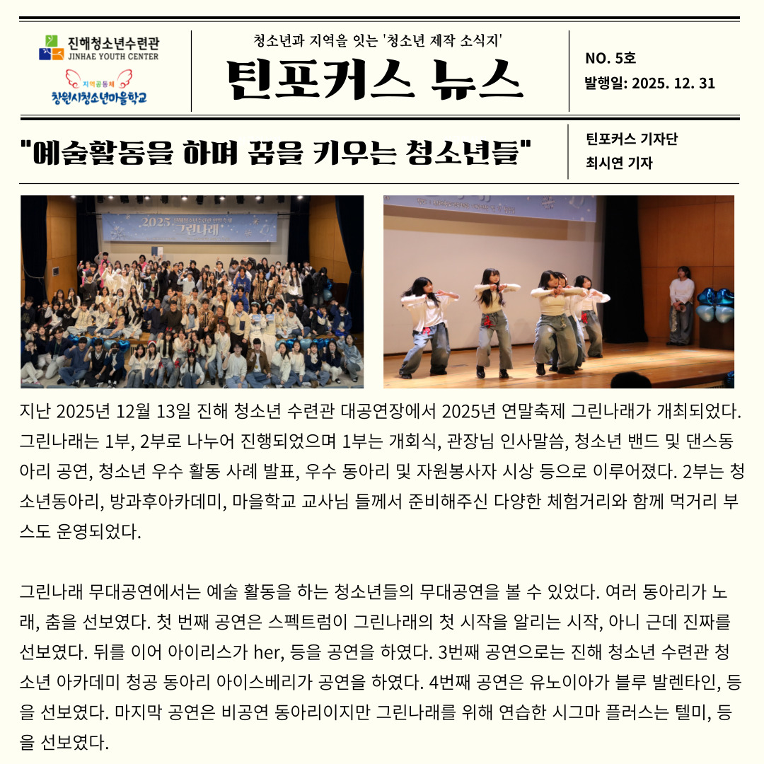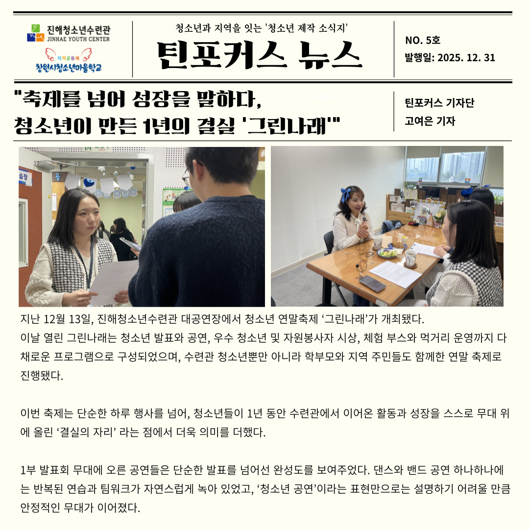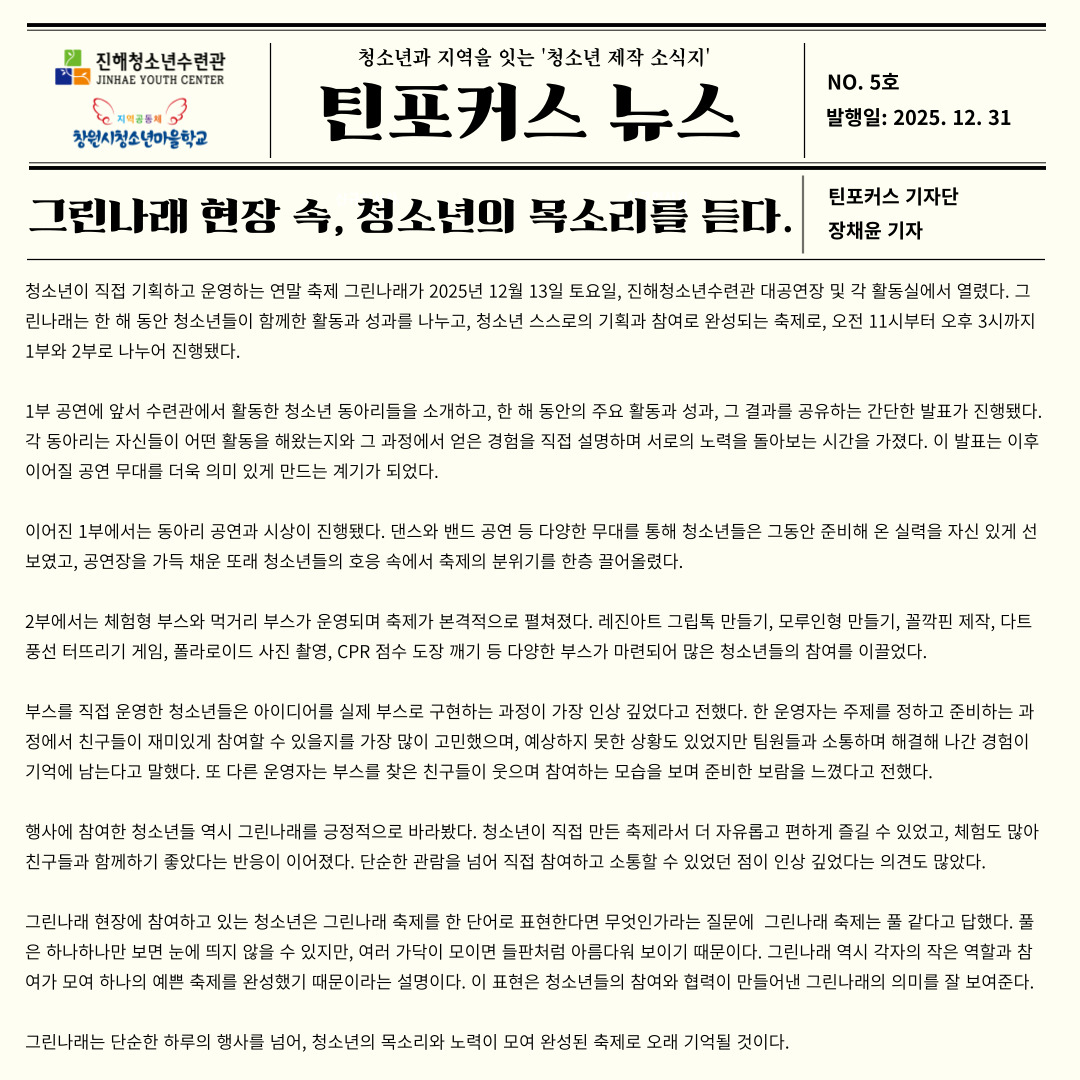 2025년 창원시청소년마을학교 청소년마을기자단 틴포커스 <틴포커스 뉴스 5호> 발간